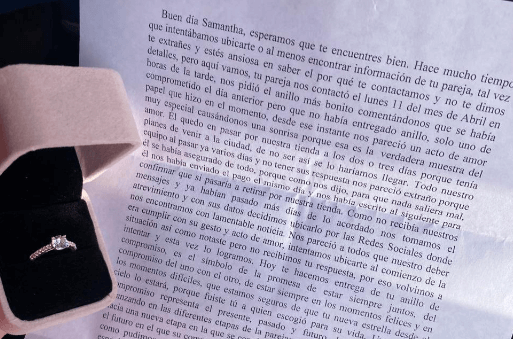 Conmovidos por la situación, decidieron enviarle el anillo de compromiso a Samantha, acompañado de una enternecedora nota que daba cuenta de lo que Alejandro sentía por ella, de cómo había elegido el anillo y sus deseos para su nuevo camino sin él.